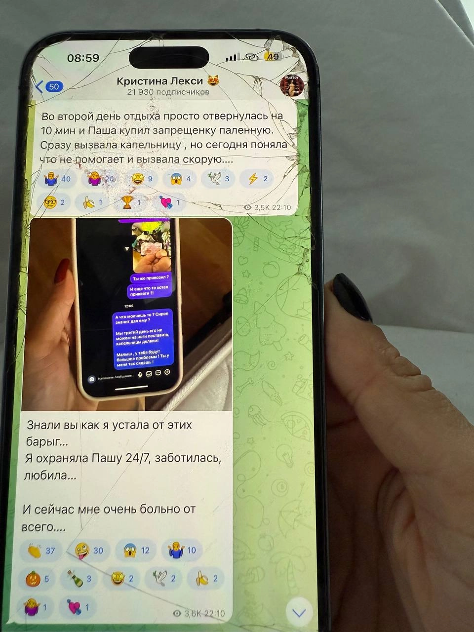 Экс-супруга заметила, что вместо того, чтобы сразу вызвать квалифицированных врачей, девушка Паши на протяжении трех дней пользовалась услугами «капельников». Это, по мнению Карицкой, усугубило состояние Павла, который позже начал захлебываться рвотой, что и привело к развитию бактериальной пневмонии. Также выяснилось, что перед выездом на отдых Техник не купил медицинскую страховку. Почему-то именно Кристина должна была нести за это ответственность по ее мнению.