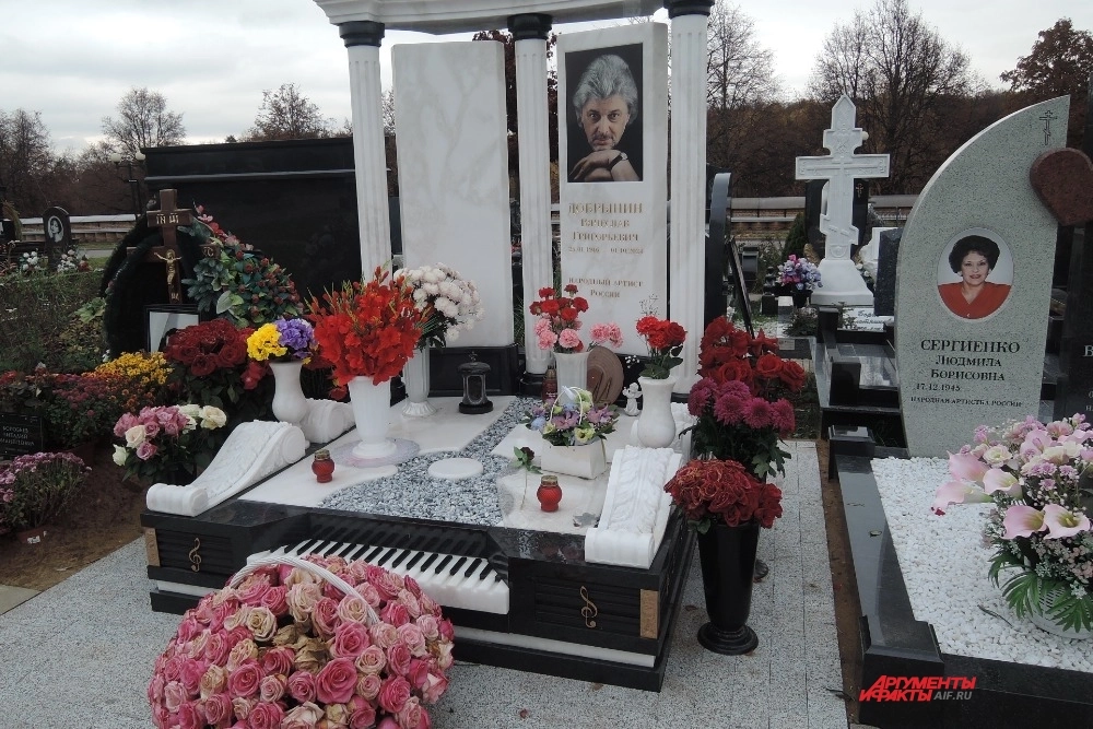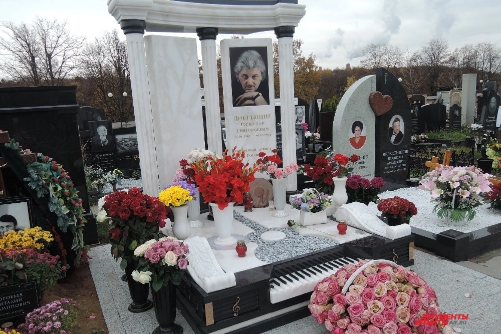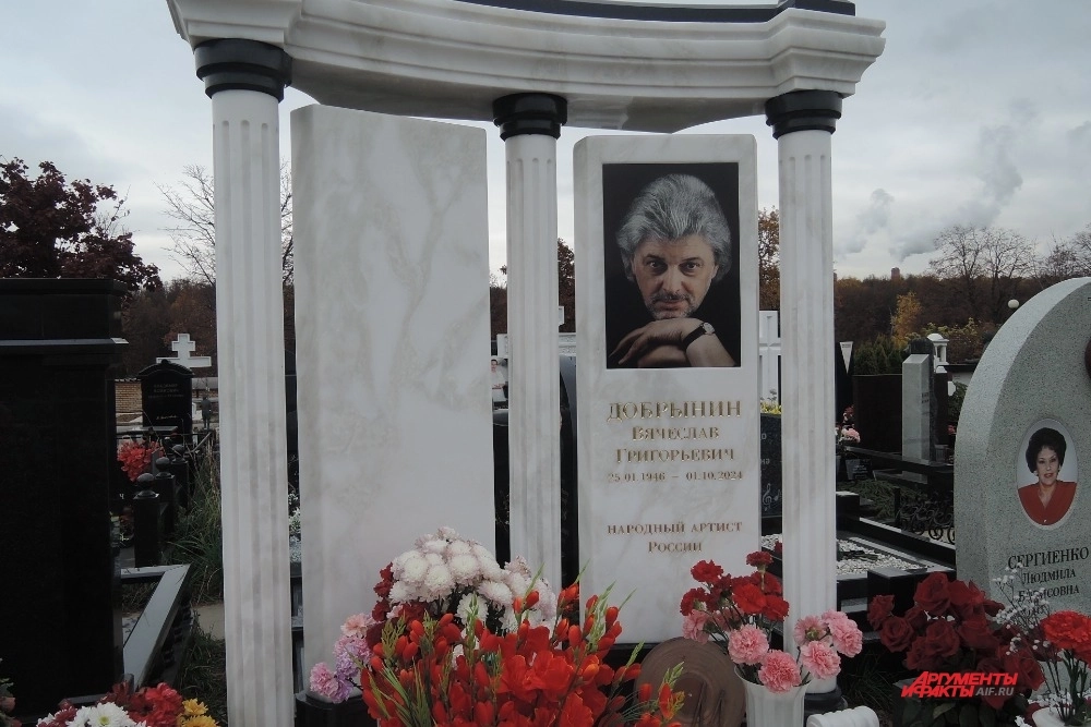 Надгробие и памятник Вячеславу Добрынину появились в сентябре 2025-го — спустя год после его смерти 1 октября 2024 года. Вдова музыканта Ирина сразу сообщила, что не нуждается в помощи и установит памятник на собственные средства. Белокаменный монумент выполнен в стиле греческой арки с двумя отдельными плитами, на одной из которых — портрет Вячеслава Добрынина. Другая — пустая.