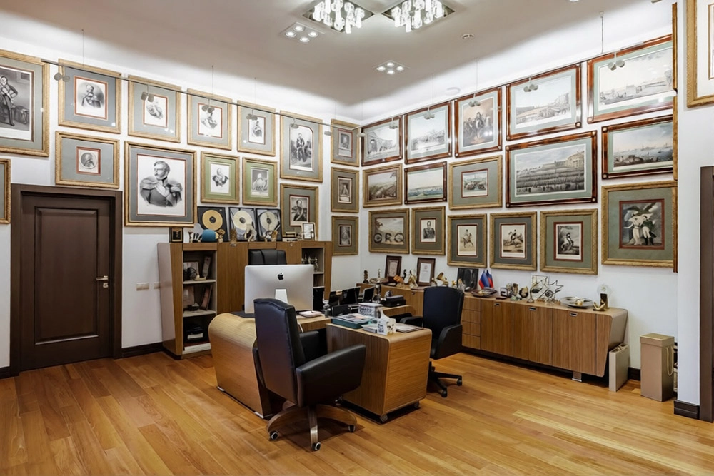 Патриотично выглядит кабинет артиста — на одной из полок стоит российский флаг, там же — многочисленные кубки, выигранные в музыкальных конкурсах.