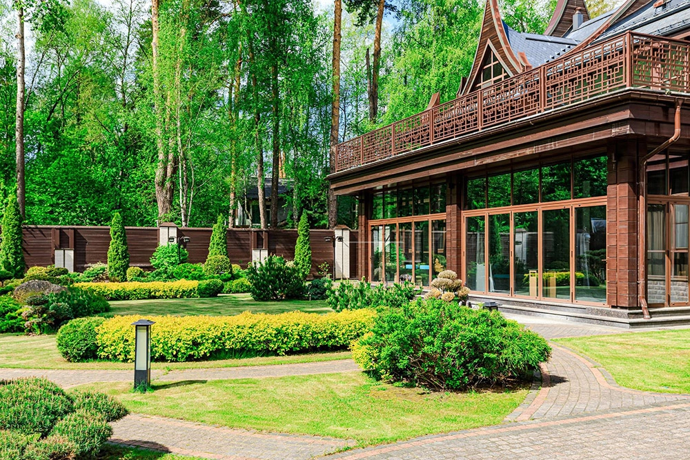 Резиденция — именно так пишут в объявлении — располагается в охраняемом коттеджном поселке в Подмосковье. Основной дом площадью 1885 кв. м выполнен в стиле этнический модерн.