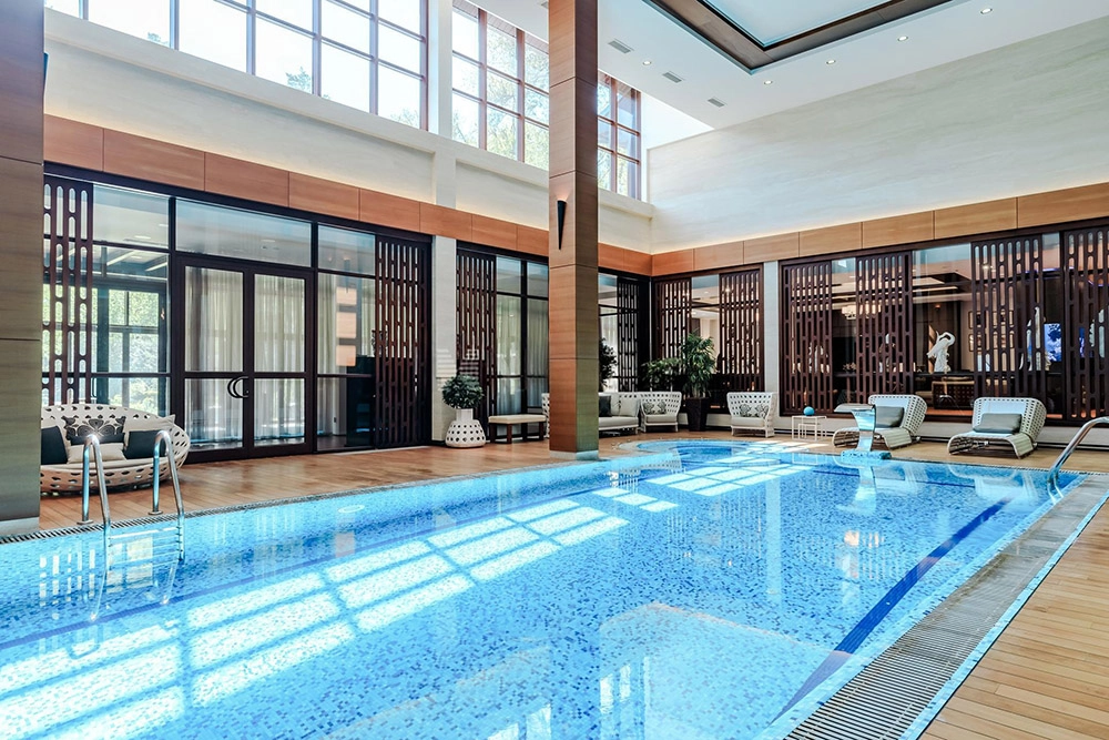 Особая гордость дома — шикарная спа-зона с великолепным бассейном и сауной, пишут риелторы. Правда, бассейн в доме меньше, чем библиотека. По крайней мере, так кажется. Примечательно, что рядом с водой поставлен только один шезлонг. Сауна достаточно небольшая — скромная и без излишеств.