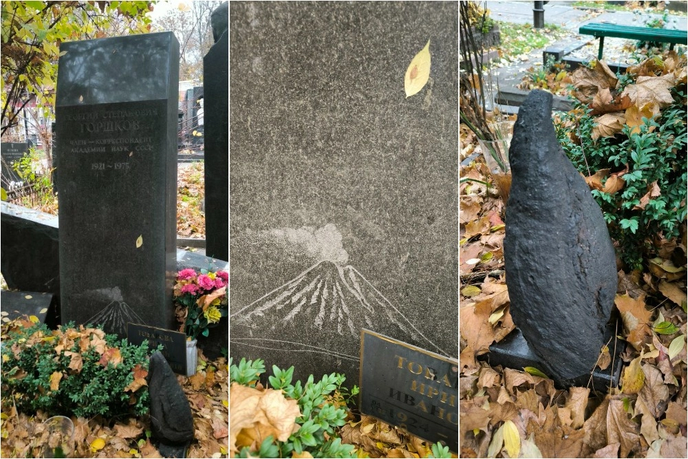 Пожалуй, один из самых странных памятников Новодевичьего установлен на могиле Георгия Горшкова. «Он был вулканологом, изучал вулканы Курильской гряды. О профессии на памятнике нам рассказывает не только курящийся вулкан, но и самое интересное изображение вечного огня — огонь, застывший в вечности. Кусок лавы из недр нашей планеты», — подчеркнул Евдокимов.