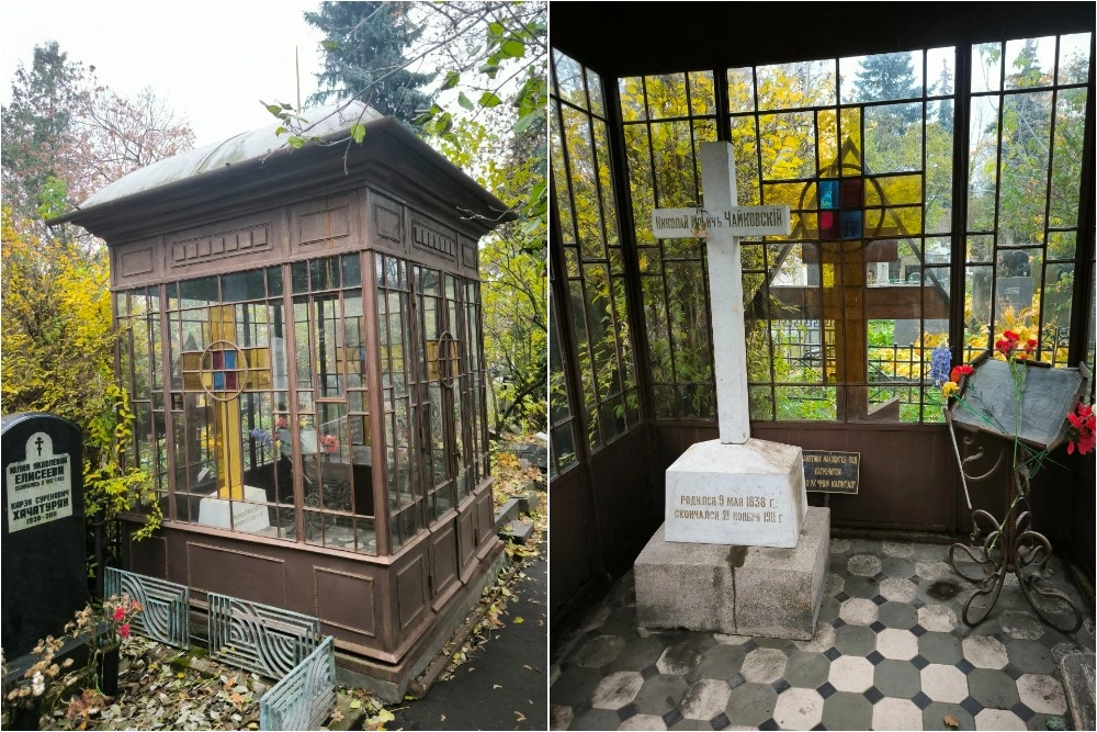 «Одной из первых мы увидели могилу Чайковского. Брат композитора Петра Ильича Чайковского — Николай Ильич — работал инженером путей сообщения. У него у единственного сохранилась на Новодевичьем кладбище часовня, металлическая конструкция со стеклами и витражами в виде крестов. Реставрация была проведена в 2010-е годы, но теперь тоже требуется некоторый уход, потому что часть металла проржавела и есть выбитые стёкла. Напольное покрытие — метлахская плитка, которую можно вставить в парадных подъездах доходных домов. Белый памятник в виде креста выполнен в мастерской, которая находилась у Дорогимиловского кладбища, сбоку на памятнике есть как раз клеймо», — рассказывает Евдокимов aif.ru.