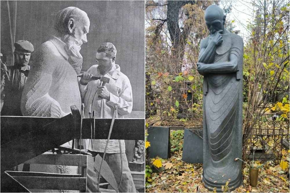«Наверное, больше всем знакомы другие его работы — эскиз рубиновых звёзд на башнях московского Кремля. Примечательно его захоронение не только сочетанием фамилии, имени и отчества, но и композицией памятника. Обломленный сверху обелиск, обозначающий конечность жизни, выполнен из лабрадорита. Камень с самым большим количеством синеньких включений. И металлический барельеф. Для людей творческой профессии такие памятники стали популярным видом надгробий на Новодевичьем кладбище в 1950-е годы», — добавляет Евдокимов.