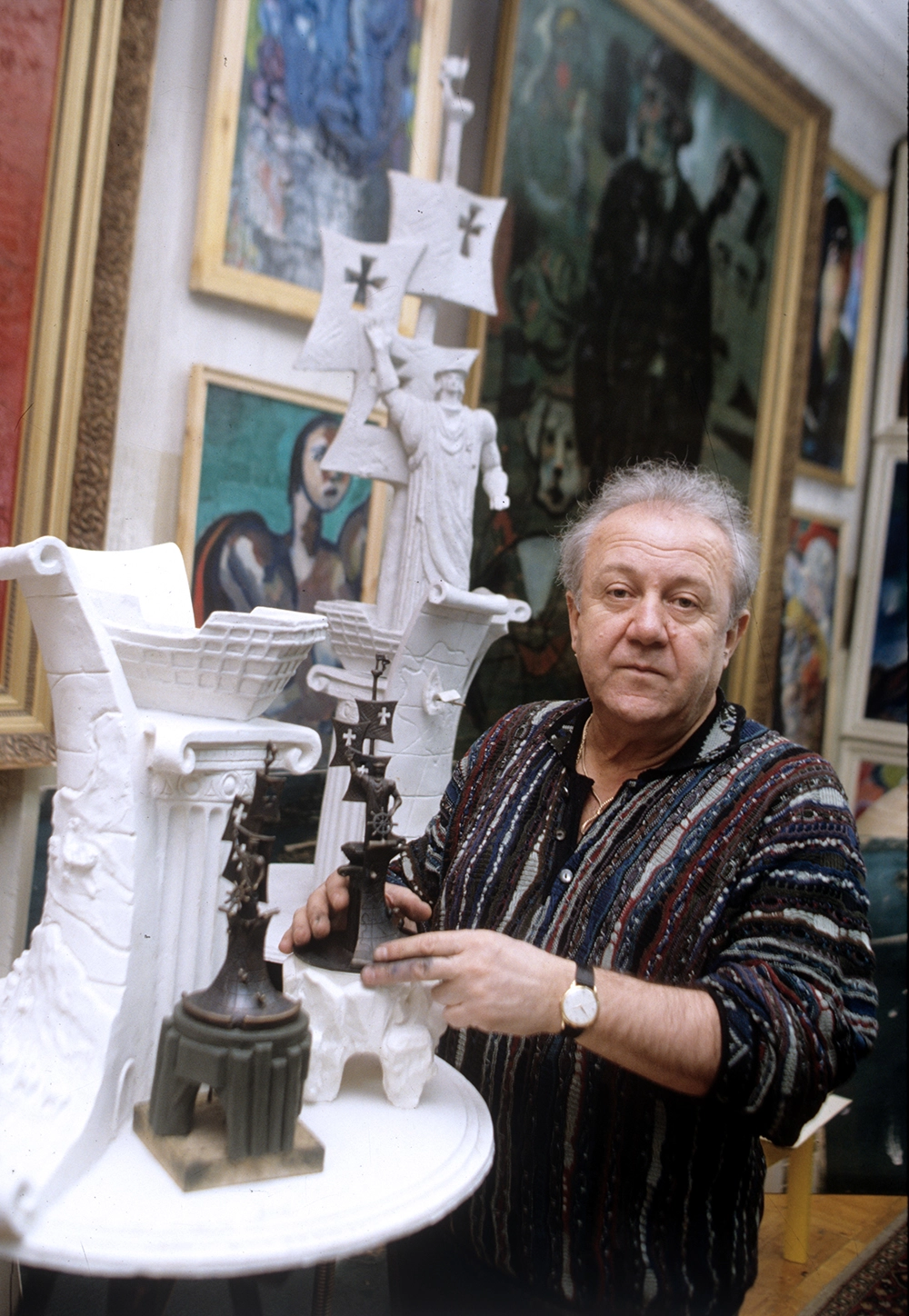 Зураб Церетели с моделью скульптурной композиции, посвященной 500-летию открытия Америки мореплавателем Христофором Колумбом, 1994 год. Фото: РИА Новости/ Владимир Федоренко