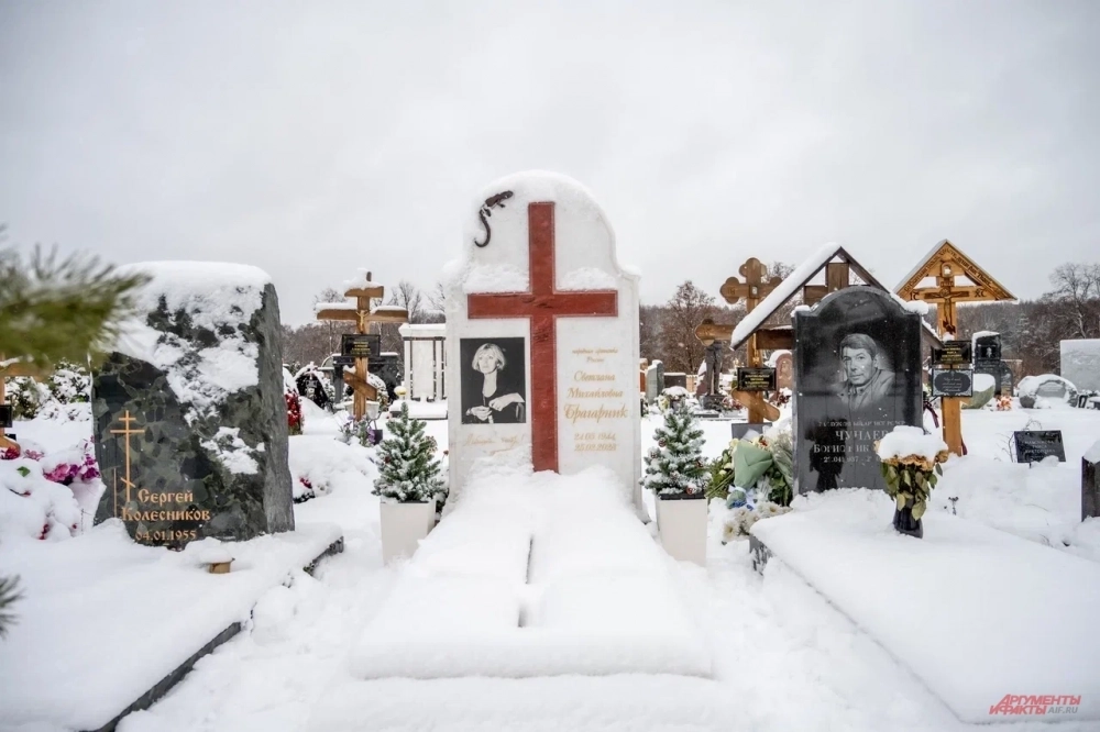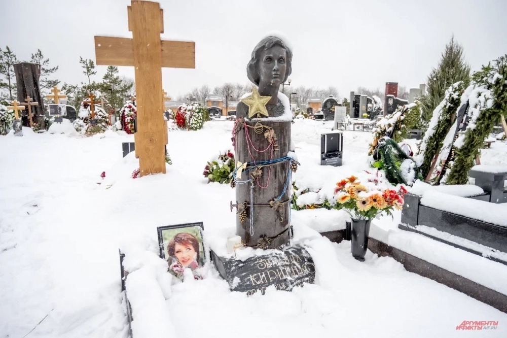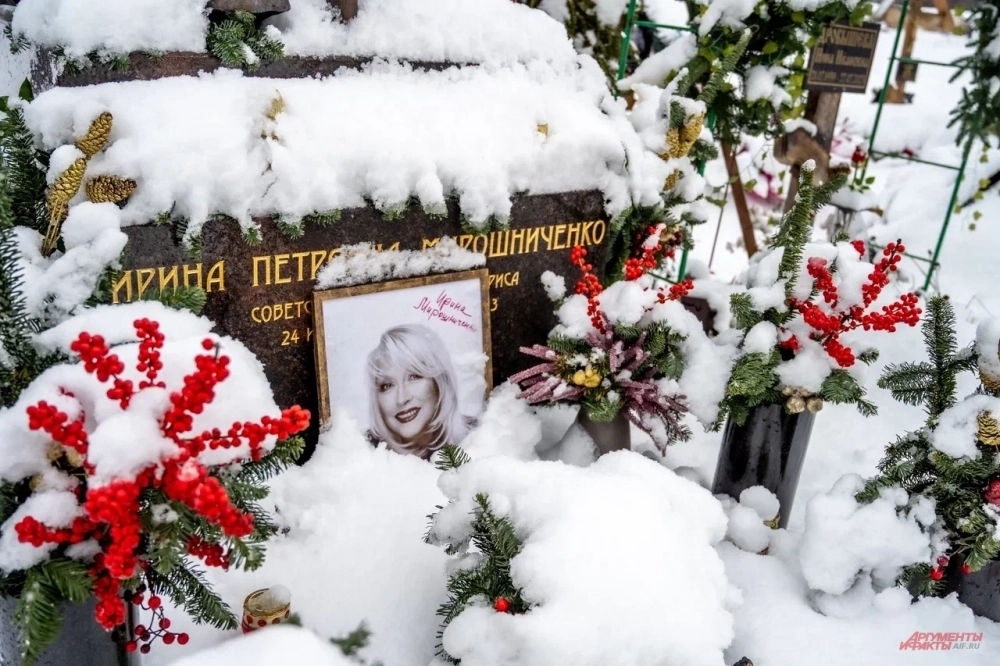 Празднично украшена и могила актрисы Ирины Мирошниченко, умершей в августе 2023 года. Недавно тайный поклонник установил на месте ее захоронения шикарный памятник. Он изображает выглядывающую из театральной кулисы артистку в полный рост. Весь постамент памятника сейчас заставлен новогодними композициями из еловых веток с разноцветными блестящими шариками.