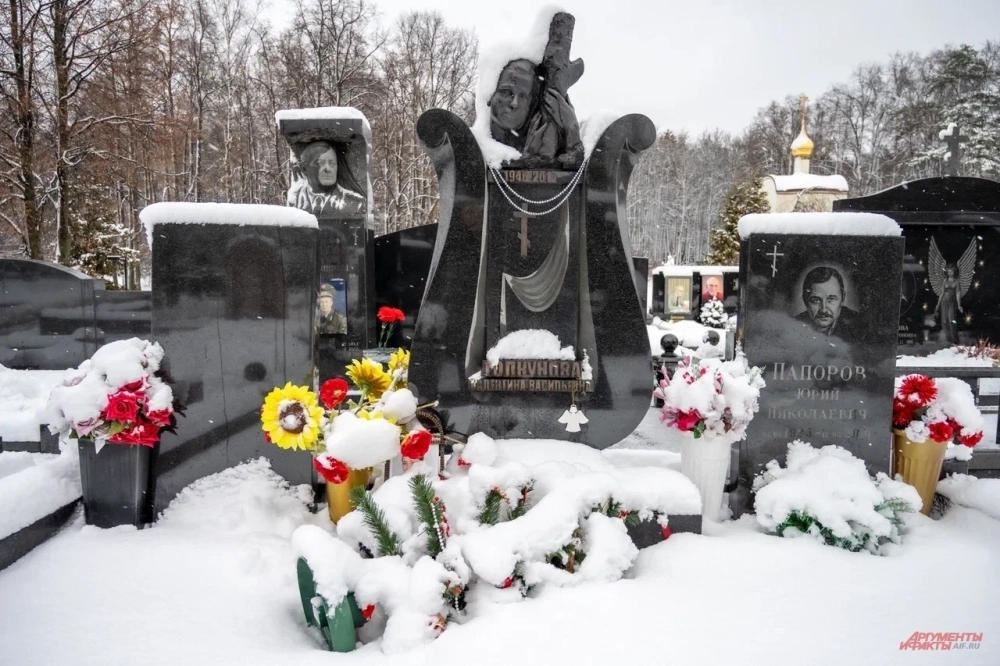 Ёлочку с бусами и игрушками поставили и на могилу певицы Валентины Толкуновой. Исполнительница знаменитых песен «Спят усталые игрушки» и «Я не могу иначе» упокоена рядом со своим мужем, журналистом-международником Юрием Папоровым. Он ушел из жизни спустя всего полтора месяца после смерти Валентины. Справа стоит третья плита — пока что пустая. Третье место — для их сына Николая Папорова. Это он заказал этот мемориальный комплекс родителям. И себе место приготовил.