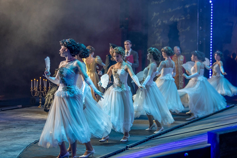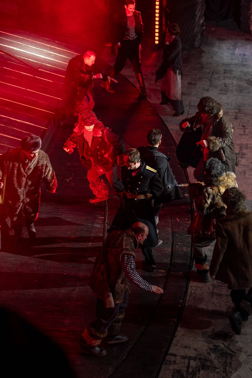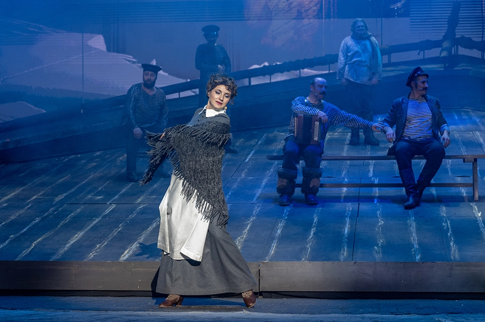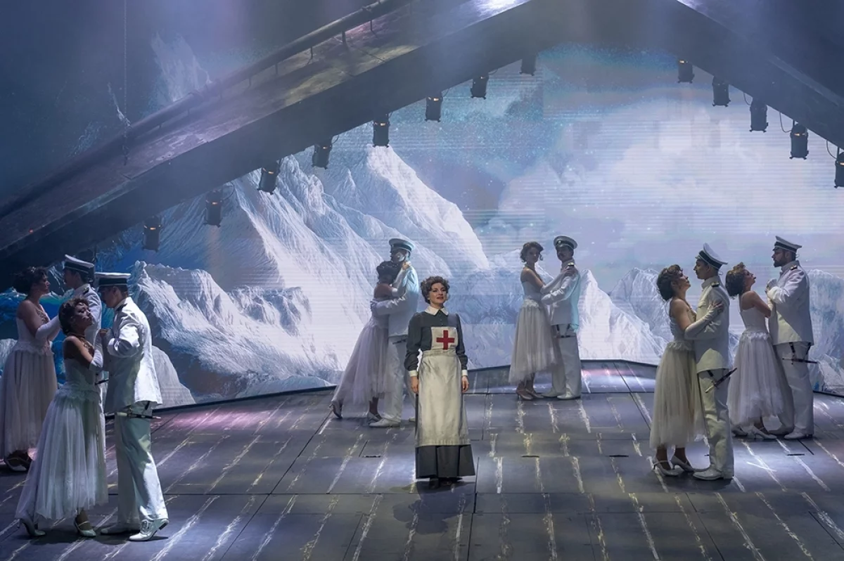 В центре повествования — история любви, пронесённой через ледяной ад. Действие спектакля разворачивается на палубе корабля, накренившейся в сторону зрителей. А дальше — все, как мы любим: мощное вступление, вспышка света, восхитительный вальс — моряки в белоснежных кителях, дамы в воздушном... И на контрасте — команда судна, застрявшего в ледяных торосах, с залихватским хором «Баба на борту».