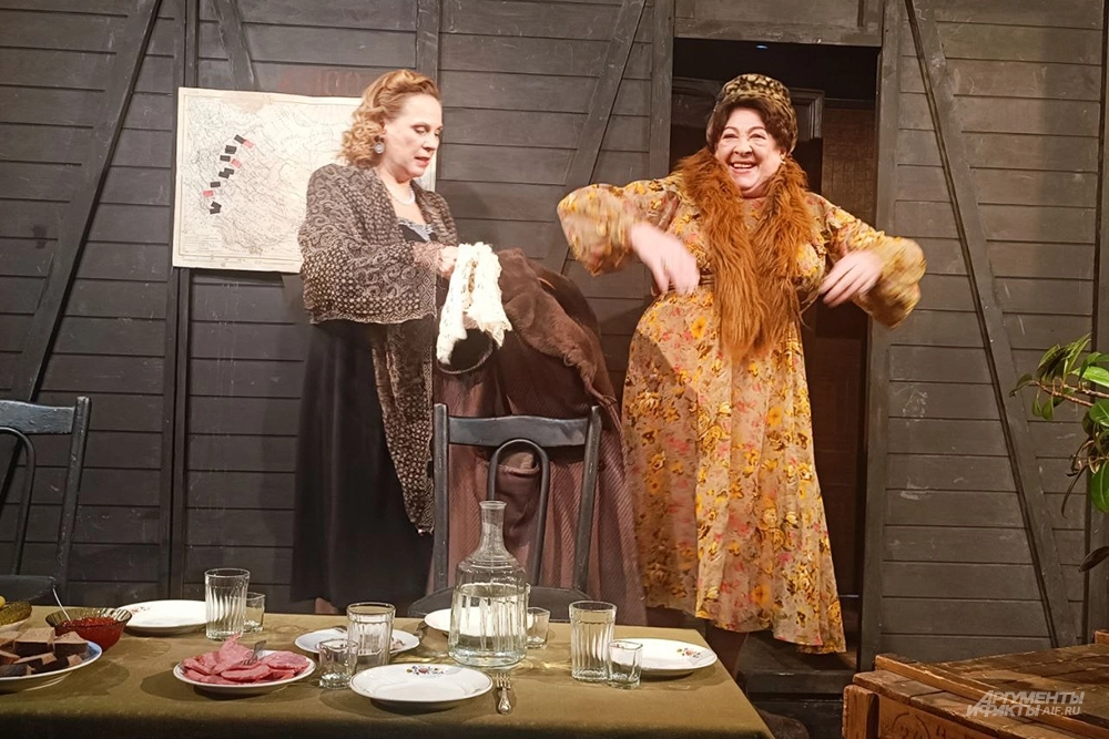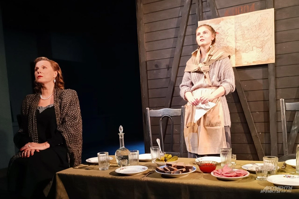 В «Покровка.Театр» образ Монастырской более выпуклый. Дина Корзун появляется во втором акте спектакля. У нее 5 или 6 сцен. Тут и застолье с колбасой и красной икрой, и коробки конфет от директора филармонии, за которого Антонина Николаевна жаждет выйти замуж, хотя в Ташкенте у него жена и дети, и разговоры с гостями… Наконец сцена с Белкой (Вероникой), прибежавшей за игрушкой, подаренной ей ушедшим на фронт любимым Борисом…