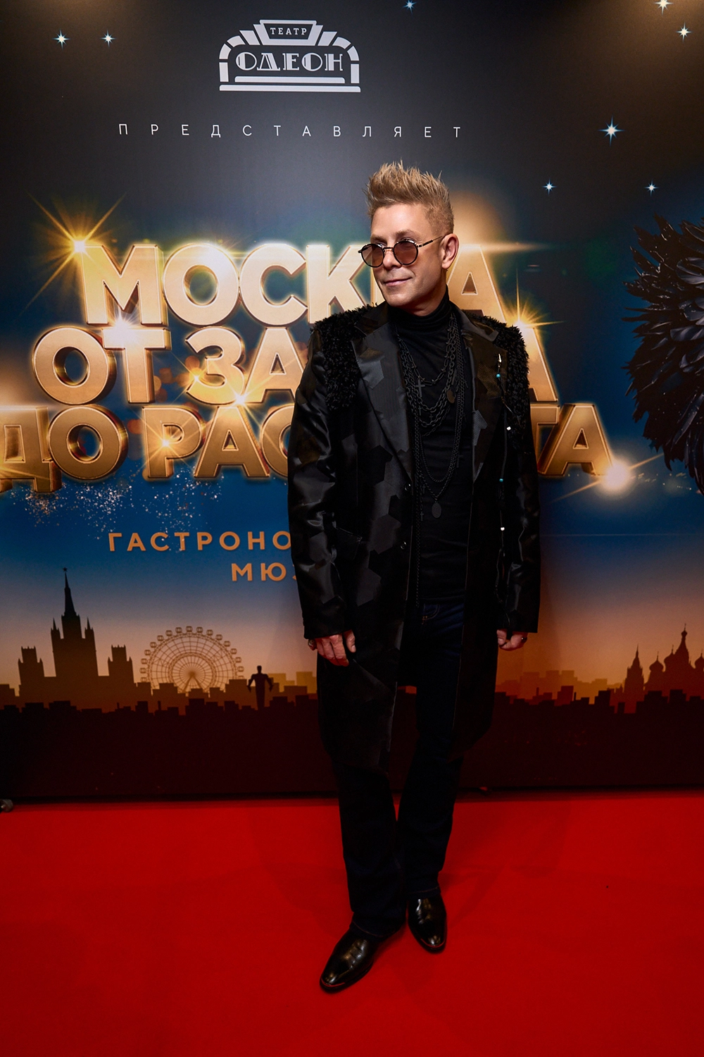Вечно молодой певец Митя Фомин выбрал для вечера экстравагантный костюм, добавив в образ круглые очки.
