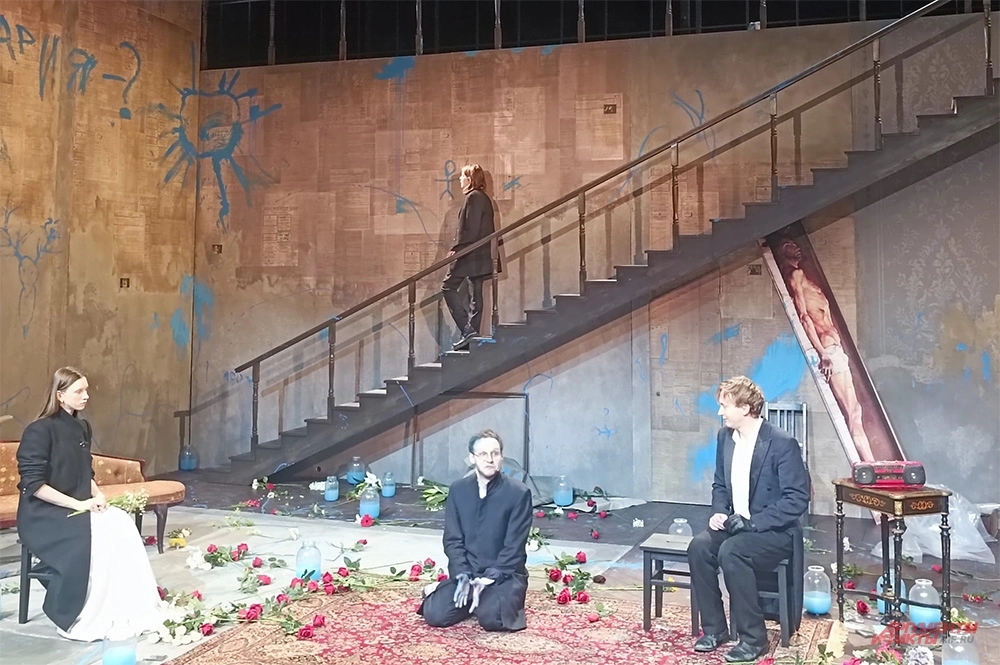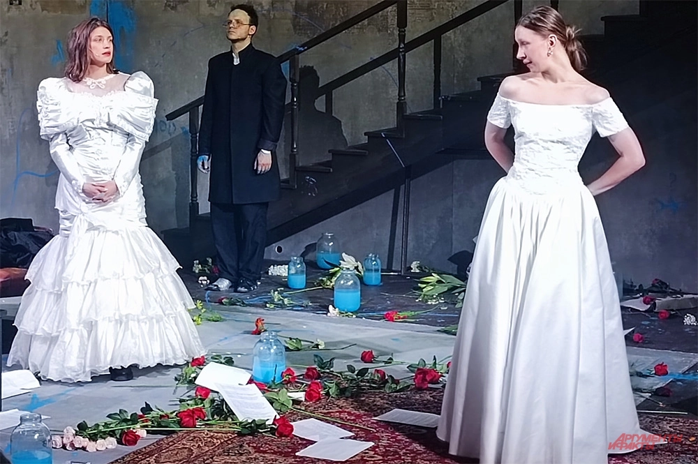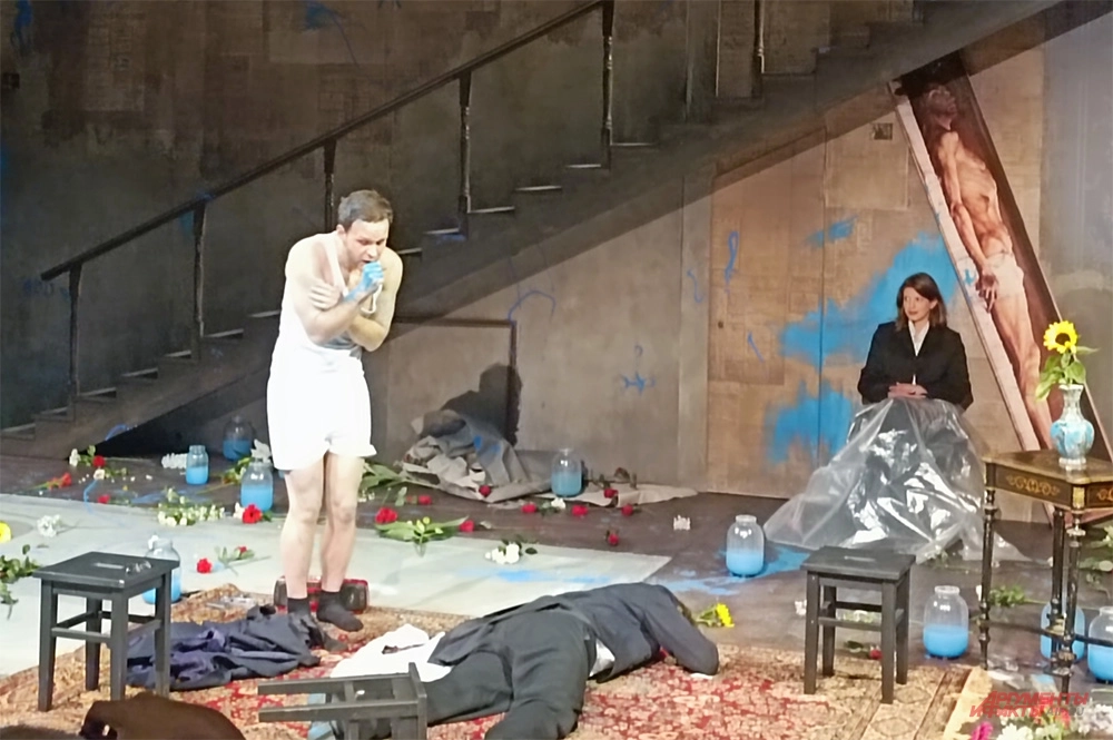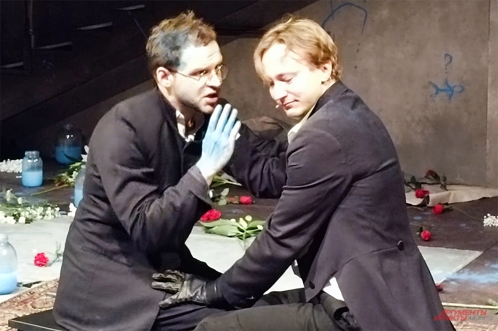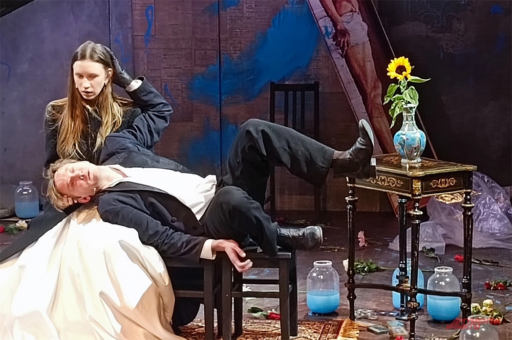 «Идиоты» здесь — князь Мышкин (Сергей Волков), Настасья Филипповна (Аня Чиповская), Рогожин (Данил Стеклов) и Аглая (Полина Романова). Да, есть еще один герой, зримо присутствующий на сцене с первой до последней минуты, — голубая ждановская жидкость, разлитая по банкам и как будто хаотично расставленная. Так же разбросаны розы. На оклеенных газетами стенах — надписи, сделанные той самой жидкостью: Питер — Швейцария, Псков... В углу — перевернутый комод, которым потом подопрут дверь. В тон ждановской жидкости — фарфоровая ваза с подсолнухом. Вазу Мышкин рукой разобьет вдребезги — цветок останется. Одинокий и несчастный, как сам князь.