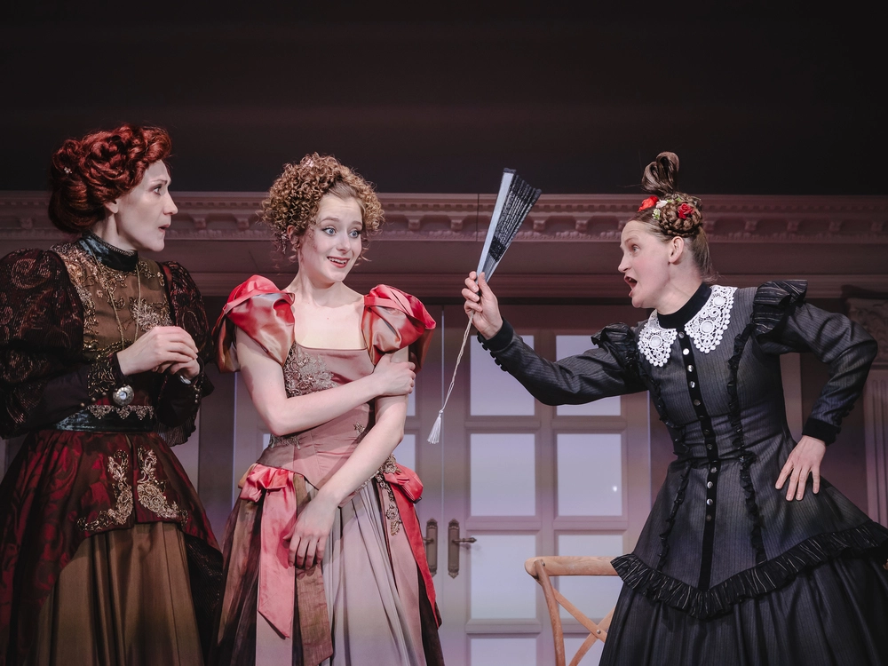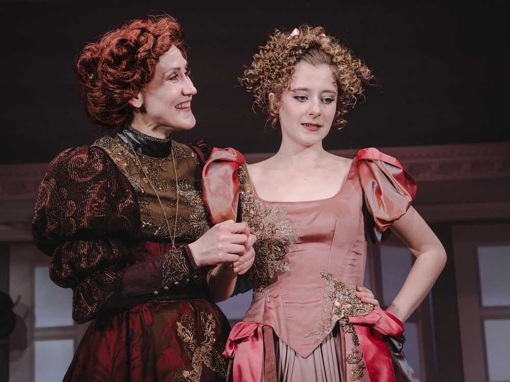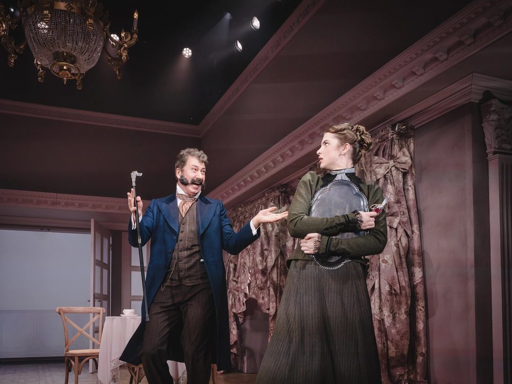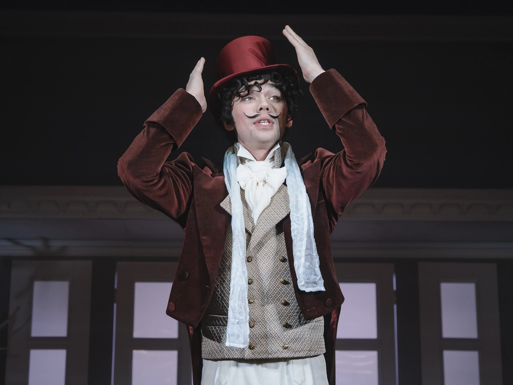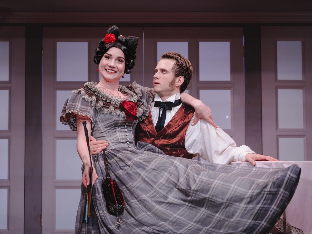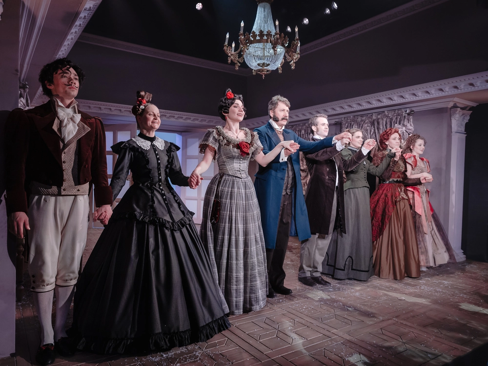 Впрочем, в «Табакерке» образца 2026 года есть ещё один плюс — изысканные исторические костюмы героев. И особенно — героинь. За них в постановке отвечала потомственный (в третьем поколении!) театральный художник Мария Боровская. Если в тексте ХIХ века не изменено ни слова и пьесу не пришлось осовременивать, значит, и костюмы должны сохранять стиль Санкт-Петербурга середины позапрошлого столетия, и парики, как отметила Софья Бейман, — быть тяжелыми.