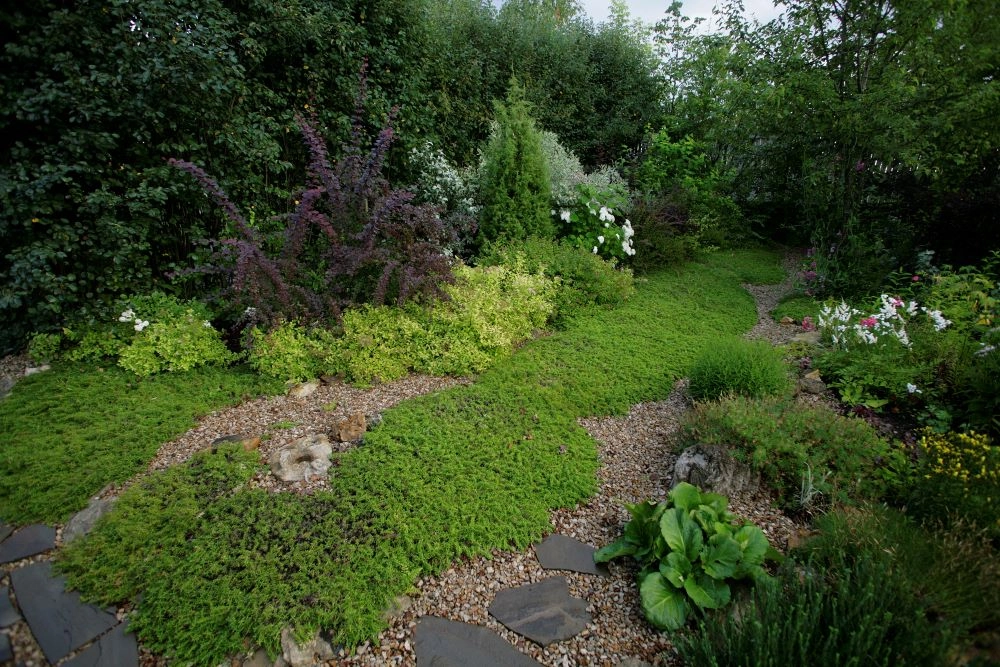Можно поступить и так: на участке — лужайка классического газона, которую реально скосить за 20 минут, а все остальные газоны — такие, которые не требуют скашивания. Это, например, такие газоны, как:
