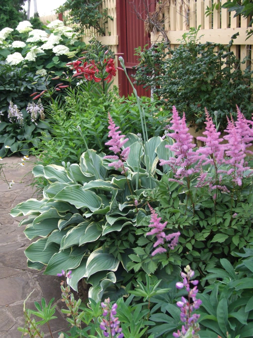 - Многолетники: хоста, астильба, дицентра, бруннера, аквилегия, луговая герань, люпин, купальница, ирисы, мелколепестник красивый, калужница, печёночница, садовый тысячелистник, энотера, рудбекия, дороникум восточный, лилейники, дельфиниум, флоксы, очиток едкий, бадан, горец змеиный, колокольчик скученный, пионы, роджерсия, гипсофила, все луковичные цветы, каменоломка, живучка ползучая.