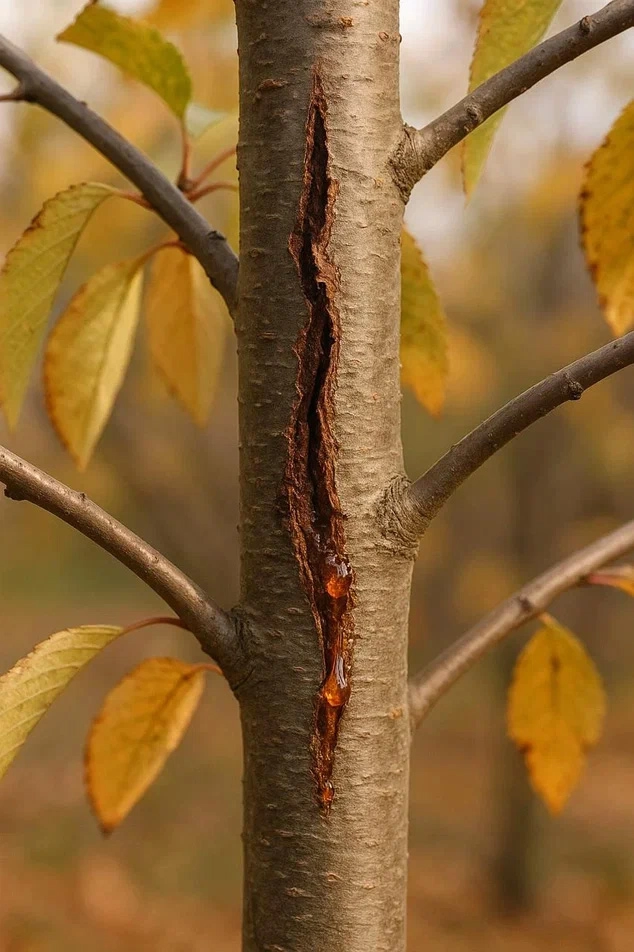 Молодые косточковые особенно чувствительны к перепадам температуры и солнцу. Поэтому все молодые деревца — не только вишню и черешню, но и абрикос, персик, сливу — желательно белить с осени. Это простое действие предотвращает 90% подобных трещин и сохраняет кору целой.