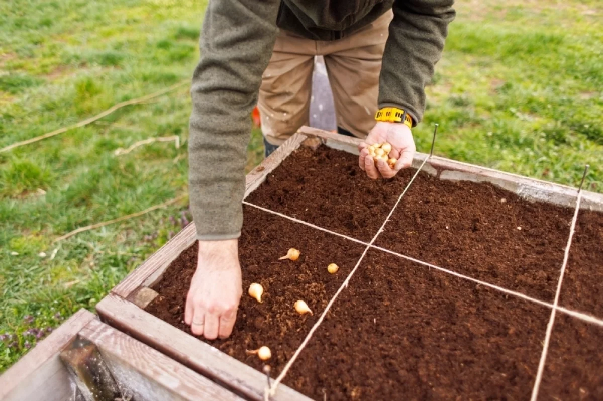Техника посадки простая: формируется борозда глубиной около 3–4 см, севок устанавливается донцем вниз, после чего присыпается рыхлой почвой без уплотнения. Вдавливать его в землю нельзя, поскольку это повреждает зачатки корневой системы.