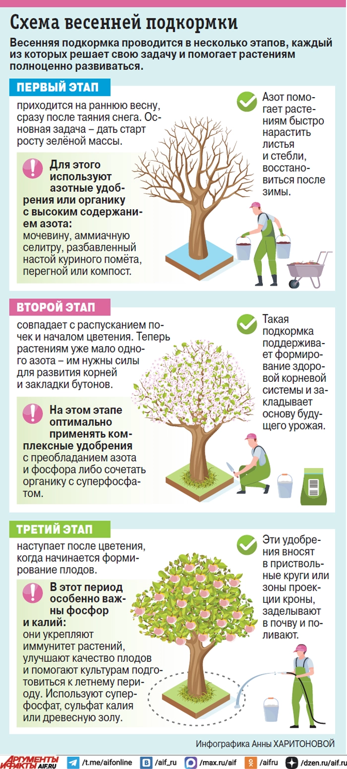 «Первую подкормку в своём саду провожу ещё по снегу. Если успеваю приехать в сад, когда остаётся около 10–15 сантиметров снега, раскидываю под плодовыми, на грядках под будущие посадки овощей, на клумбах комплексное гранулированное удобрение с пометкой «Весна» любой фирмы. В составе — азот, фосфор, калий, микроэлементы, а также бактерии. Подкармливаю всё, что сердцу дорого.