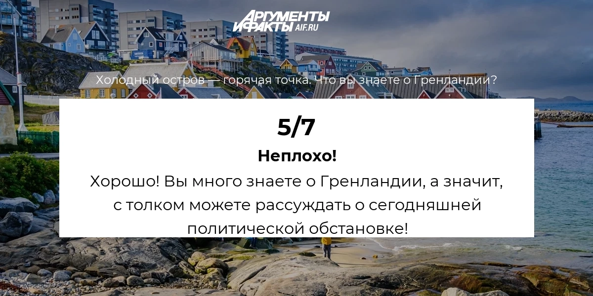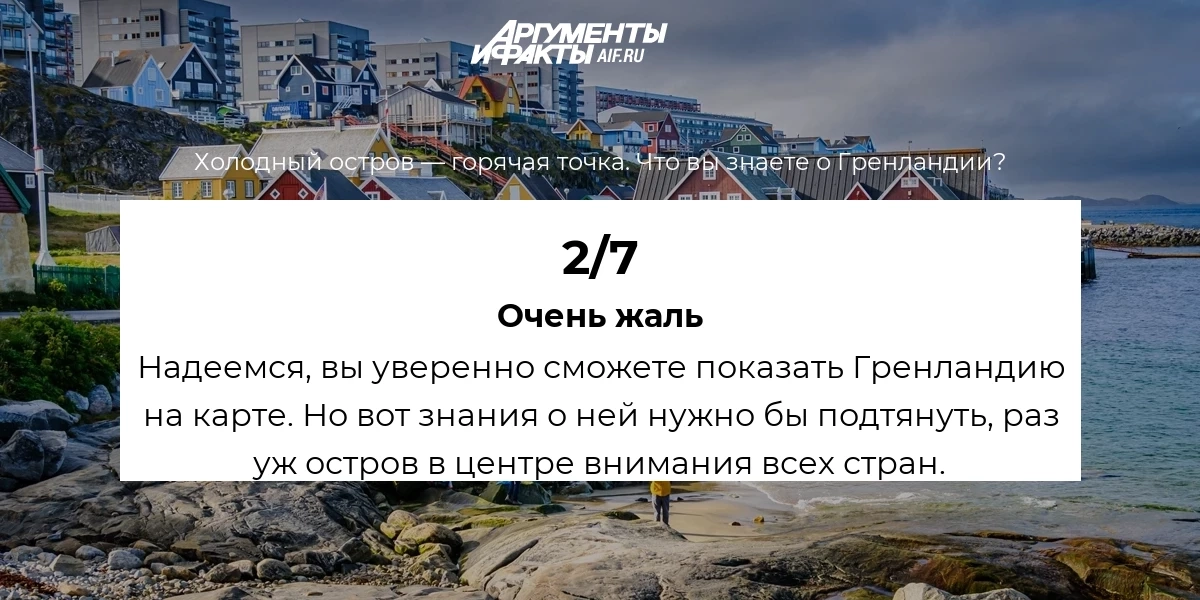 Гренландия — одна из точек на карте, к которой приковано внимание всего мира. Но что вы знаете об этом огромном, но немного таинственном острове? Проверьте свои знания в тесте aif.ru!