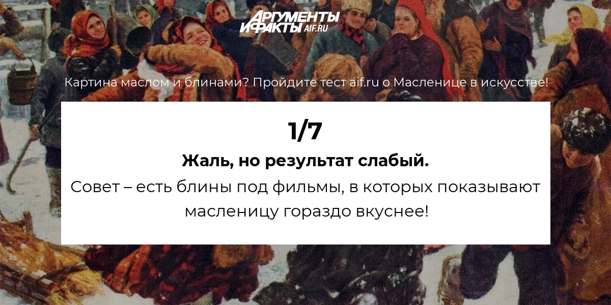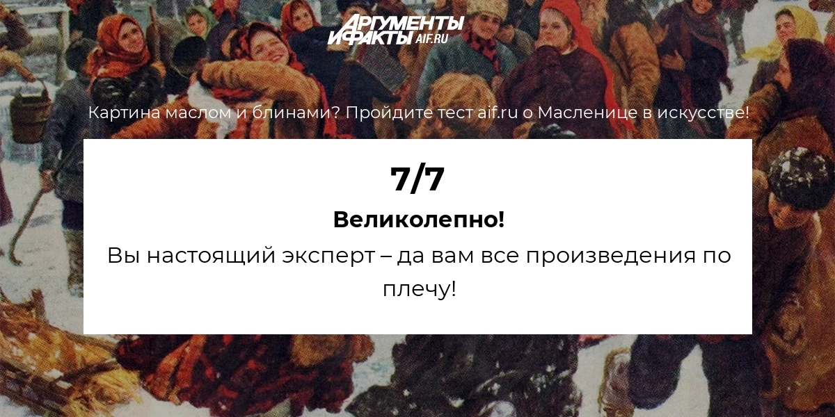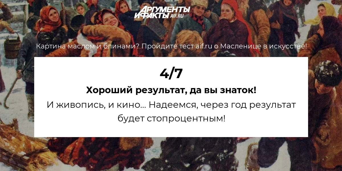 Масленица – древняя и всенародная традиция. Она нашла свое отображение в литературе, живописи, в кино. Насколько хорошо вы знаете эти произведения? Наверняка, многое вы смотрели, но сможете вспомнить? Пройдите тест aif.ru о Масленице в искусстве!