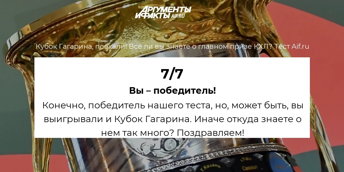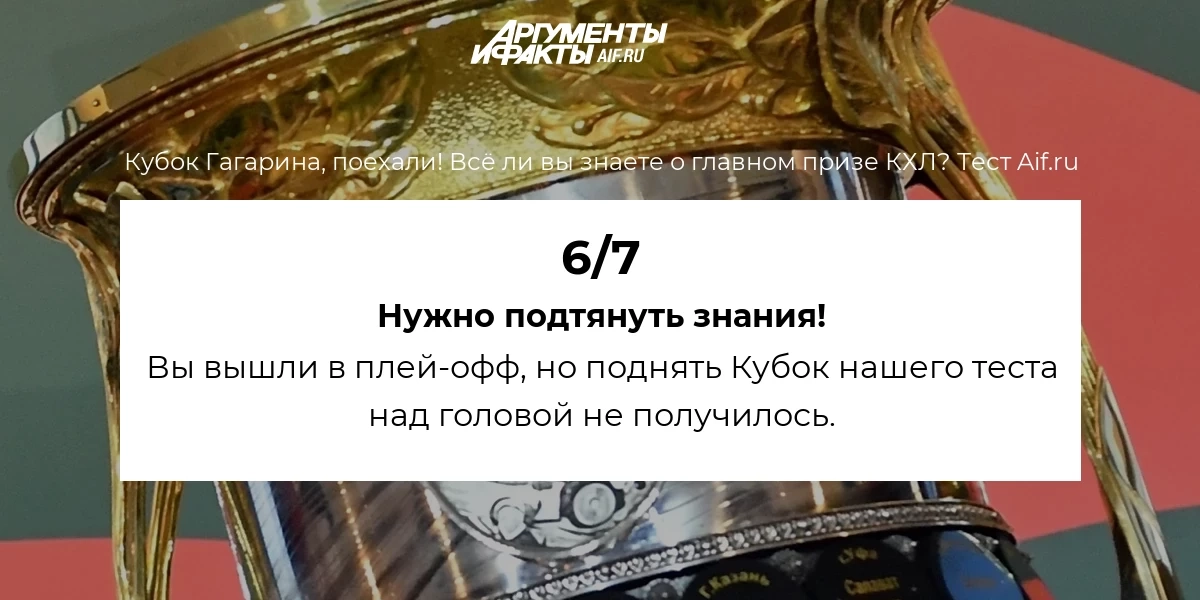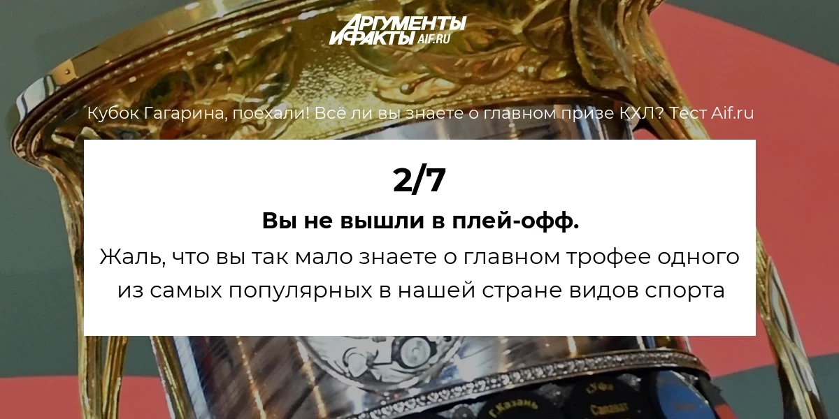 Плей-офф континтельнальной хоккейной лиги – финальная часть хоккейного сезона России и Казахстана. А главный приз – Кубок Гагарина – будет определен в мае. Как много вы знаете о главном призе российского хоккея? Проверьте свои знания в тесте aif.ru!