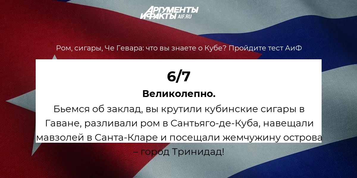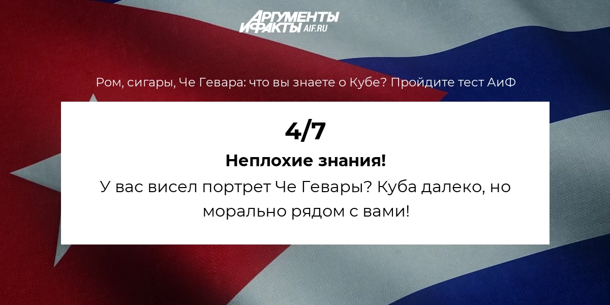 «Куба далеко — Куба рядом» — эта строка из советской песни актуальна до сих пор. Расположенный на другой стороне Земли остров в сердцах россиян занимает особое место. Для одних это «наш союзник в холодной войне», для других — страна рома и сигар, для третьих — образ Че Гевары и старые машины под ярчайшим солнцем. Но насколько хорошо вы знаете Кубу на самом деле? Попробуйте пройти наш тест и проверить себя!