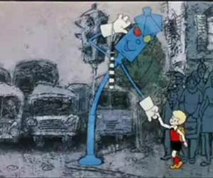 1) В 1 серии мультфильма «Малыш и Карлсон» светофор помогает мальчику перейти дорогу. Что или кого видит Малыш на другой стороне дороги?