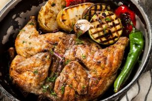 4Обжарить цыпленка с двух сторон на сковороде гриль с добавлением растительного масла (30 мл) до золотистого колера и полосок от гриля. (При жарке цыпленка периодически прижимать крышкой).