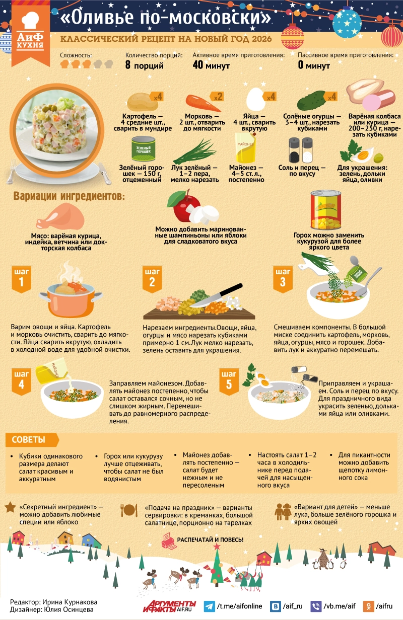 «Оливье» любят за простоту и богатый вкус. В классической московской версии — картофель, морковь, мясо, яйца и майонез. В инфографике aif.ru показываем точные пропорции, этапы приготовления и рекомендации по подаче, чтобы салат получился красивым, сочным и ароматным.