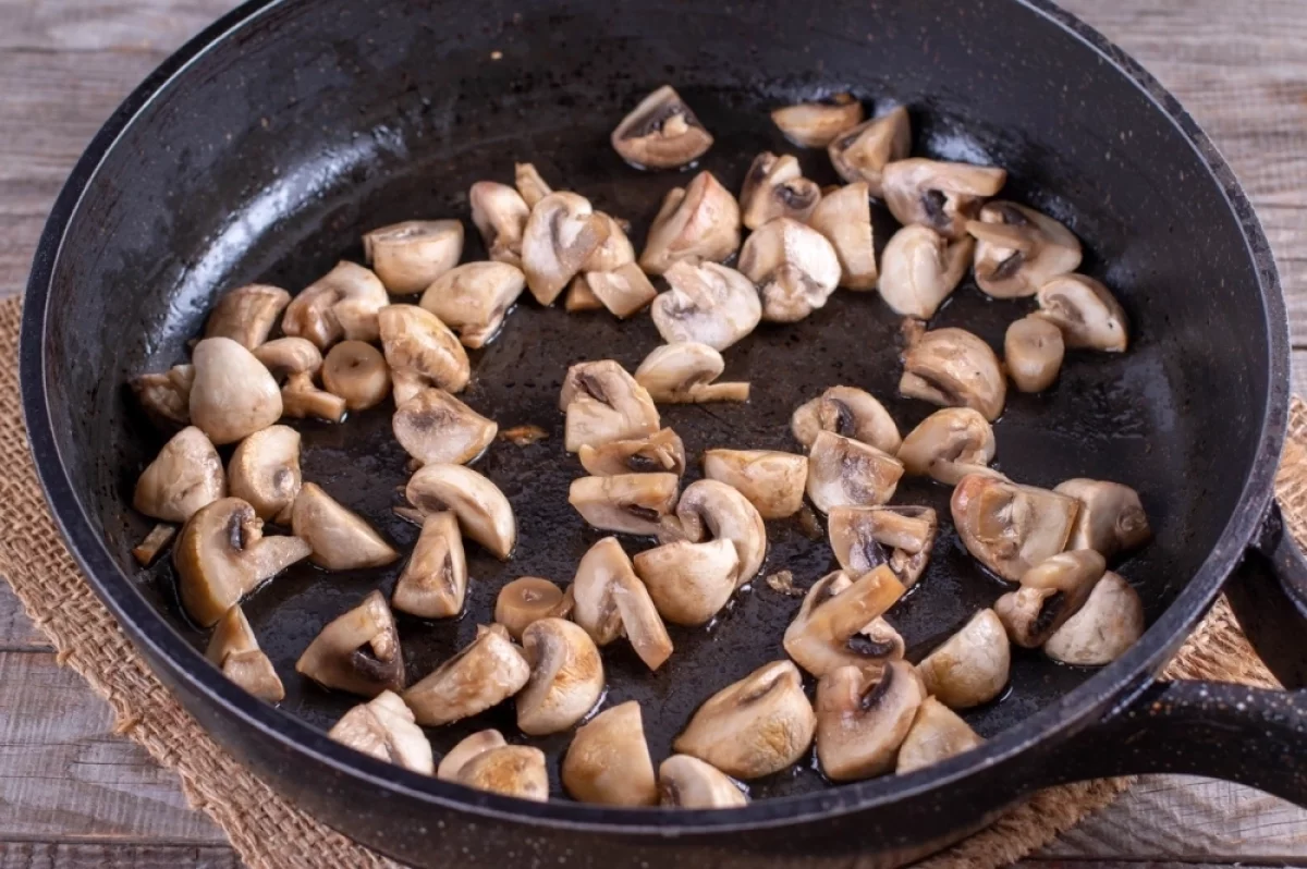 Шаг 1. Шампиньоны очистите от пленки, промойте и обсушите на салфетках. Нарежьте крупными кусочками.
