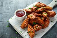 В ресторане эти крылья мы жарим во фритюре, потом наносим на них глазурь-маринад. Но можно приготовить такие крылья в духовке, сначала запечь, а потом нанести глазурь. Еще один вариант — поджарить на решетке. Также глазурь наносим в конце приготовления и еще две-три минуты обжигаем крылья вместе с ней.