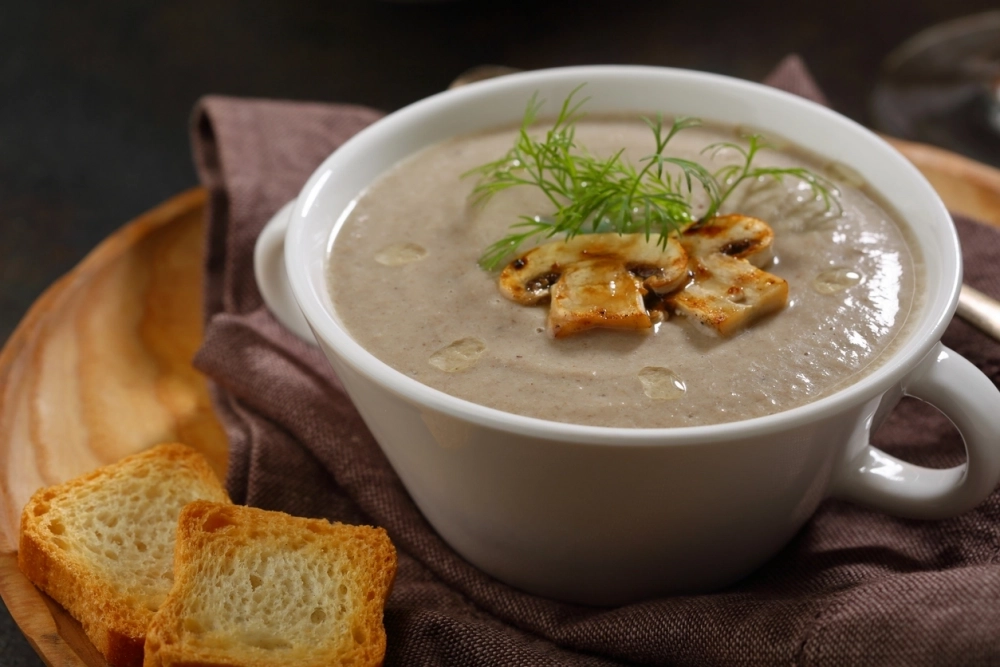 Шаг 12. Обжарьте немного белых грибов, украсьте ими суп при подаче. Можно посыпать кедровыми орешками.