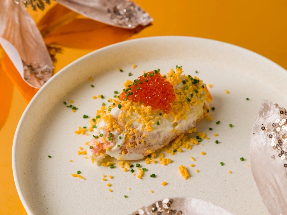 Шаг 5. Дать настояться в холодильнике 1,5-2 часа. Перед подачей посыпать желтком, украсить зеленью сибулета и красной икрой.