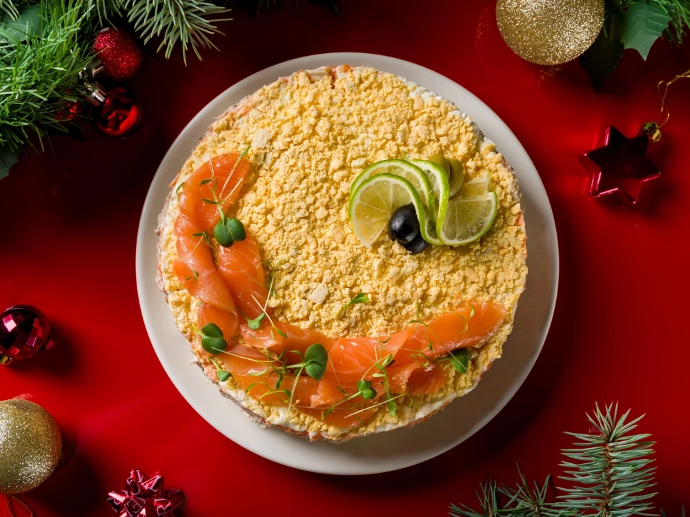Порядок слоев: картофель (половина), тунец, морковь, яичные белки, картофель (вторая половина). Покрыть весь верх салата натертыми яичными желтками и украсить ломтиками лосося.