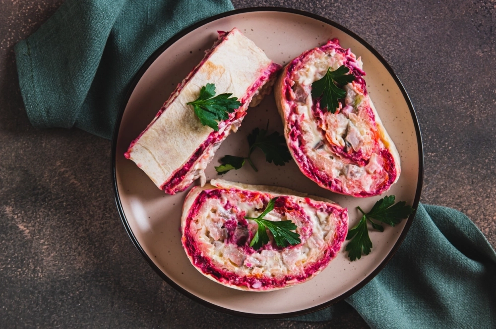 - Перед подачей нарежьте ролл на порционные кусочки (примерно 3–4 см в ширину). Украсьте свежим укропом или другими зелёными травами. Можно подавать!