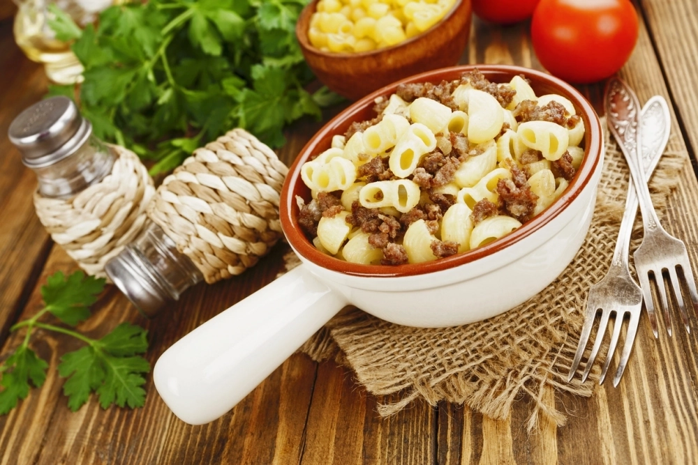 - Разложите макароны с говядиной по тарелкам, посыпьте оставшимся натёртым сыром и свежей зеленью по желанию.