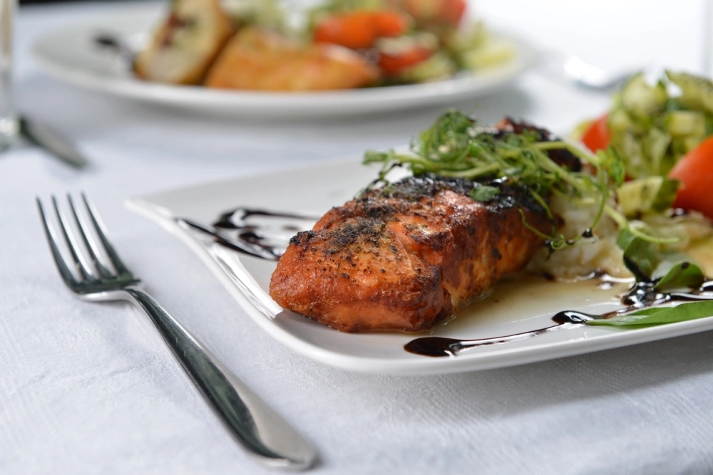 - Приготовьте лосось на сковороде или гриле до готовности (по 4–5 минут с каждой стороны). Подавайте с овощами.