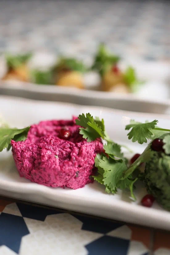 Шаг 3. В свеклу добавить ореховую пасту, мелко нарезанную кинзу, соль по вкусу, сформировать пхали в виде ровных или небрежных шариков либо продолговатых котлеток. Перед подачей украсить зернышками граната и листьями кинзы.