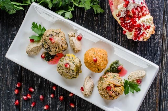 Шаг 4. В полученную массу добавить уксус и тщательно перемешать руками. Сформировать шарики. Выложить на тарелку, украсив гранатом.