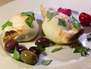 Начиняем кальмары фаршем не более чем наполовину и закалываем зубочисткой. Обжариваем по 1 минуте на растительном масле, потом добавляем оставшееся сухое вино и еще 2-3 минуты тушим, постоянно переворачивая кальмары.