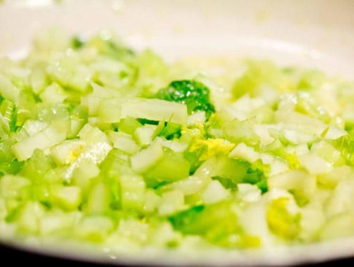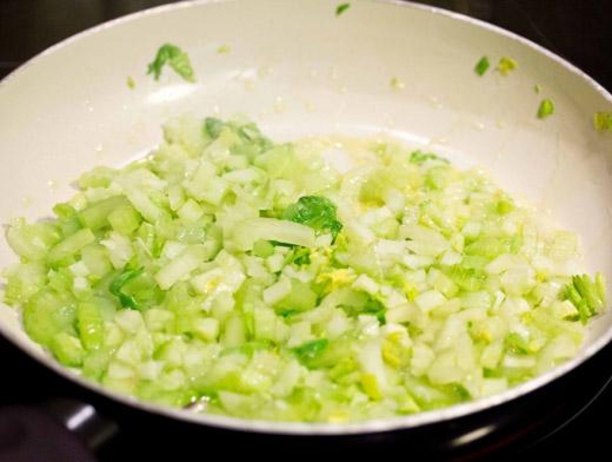 Сельдерей режем маленькими дольками и обжариваем на растительном масле - минуты две.