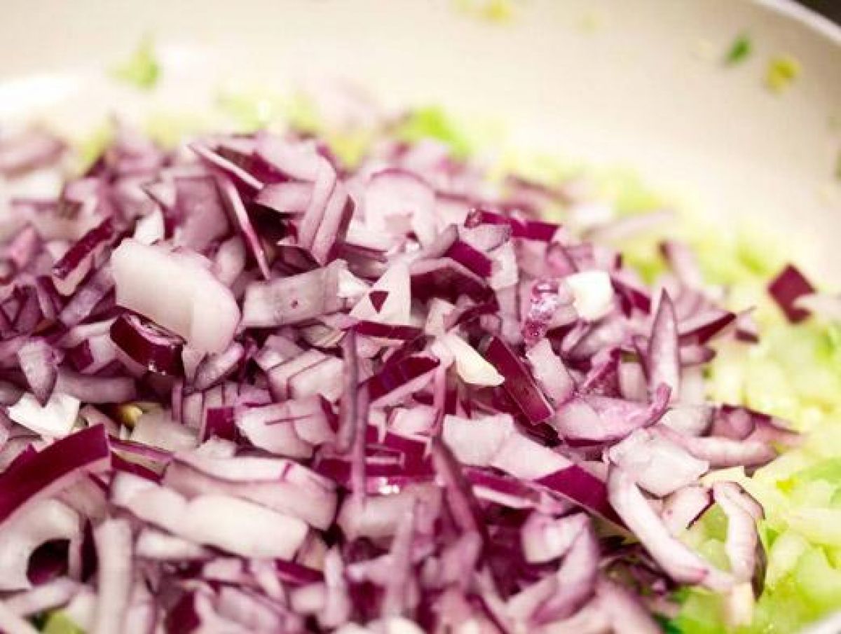 Третьим на сковородку идет репчатый лук, и тоже 2 минуты жарится.