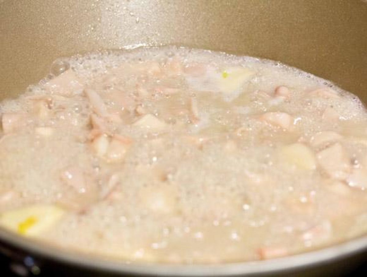 Добавляем раздавленные зубчики чеснока и заливаем 100 гр вина. Тушим еще 2-3 минуты, постоянно помешивая. Вылавливаем морских гадов, а бульон оставим.