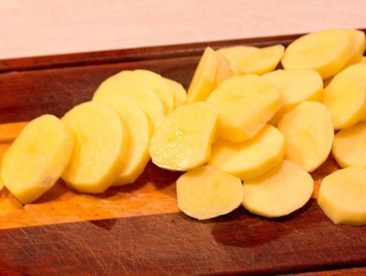 Картофель почистим, нарежем ломтиками по 5 мм. Зальем холодной водой и доведем воду до кипения. Добавим соль и через минуту кипения сольем воду.
