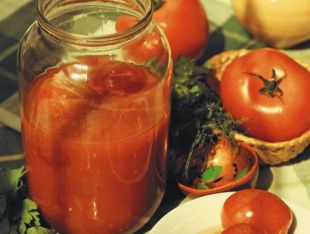 В свежевыжатый томатный сок добавь сахар и соль, прокипяти 5 минут. В среднем на 3?литровую банку нужно от 1 до 1,4 л томатного сока – в зависимости от размера помидоров (для черри хватит 1 л).