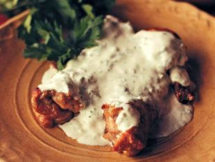 3Приготовь соус: нагрей на плите сливки, добавь сметану, всю зелень, мелко порубленный чеснок и соль. Повари 3–4 минуты.