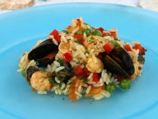 1Морепродукты разморозить. Очистить креветки, порезать кальмара. Посолить и полить лимонным соком.