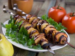 4Нанизать на тонкие шампуры печень, айву и лук.