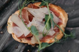 Смазать половинки багета соусом чимичура, сверху положить прошутто и тонкие лепестки пармезана.