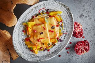 21Закарамелизированные блинчики выложить на тарелку, украсить дольками апельсина, мандарина, зернами граната, мятой, соусом Сюзетт, цедрой апельсина