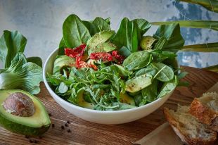 Смешать в миске все виды салата, сверху выложить слайсы авокадо и томатов. Посыпать семечками подсолнуха.